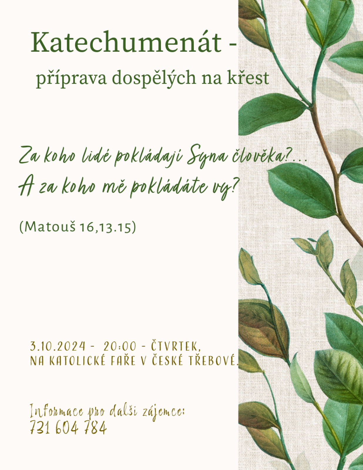 Katechumenát - příprava dospělých na křest. Katolická fara Česká Třebová, 3.10.2024 od 20:00