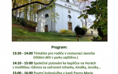 - 14:10 pěší pouť z Javorky ke kapličce Panny Marie s modlitbou růžence za uzdravení Johanky, Amálky a Jarušky