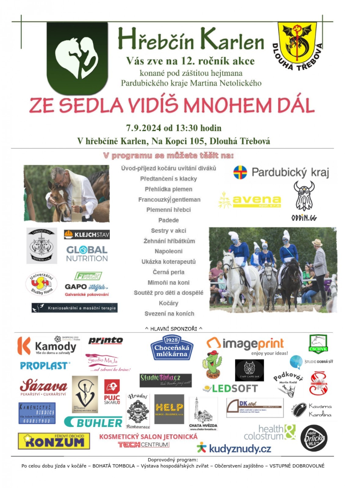 Zveme vás na akci hřebčína Karlen: Ze sedla vidíš mnohem dál, která se koná dne 7. 9. 2024 od 13 hod v hřebčíně Karlen v Dlouhé Třebové, viz přiložená pozvánka.