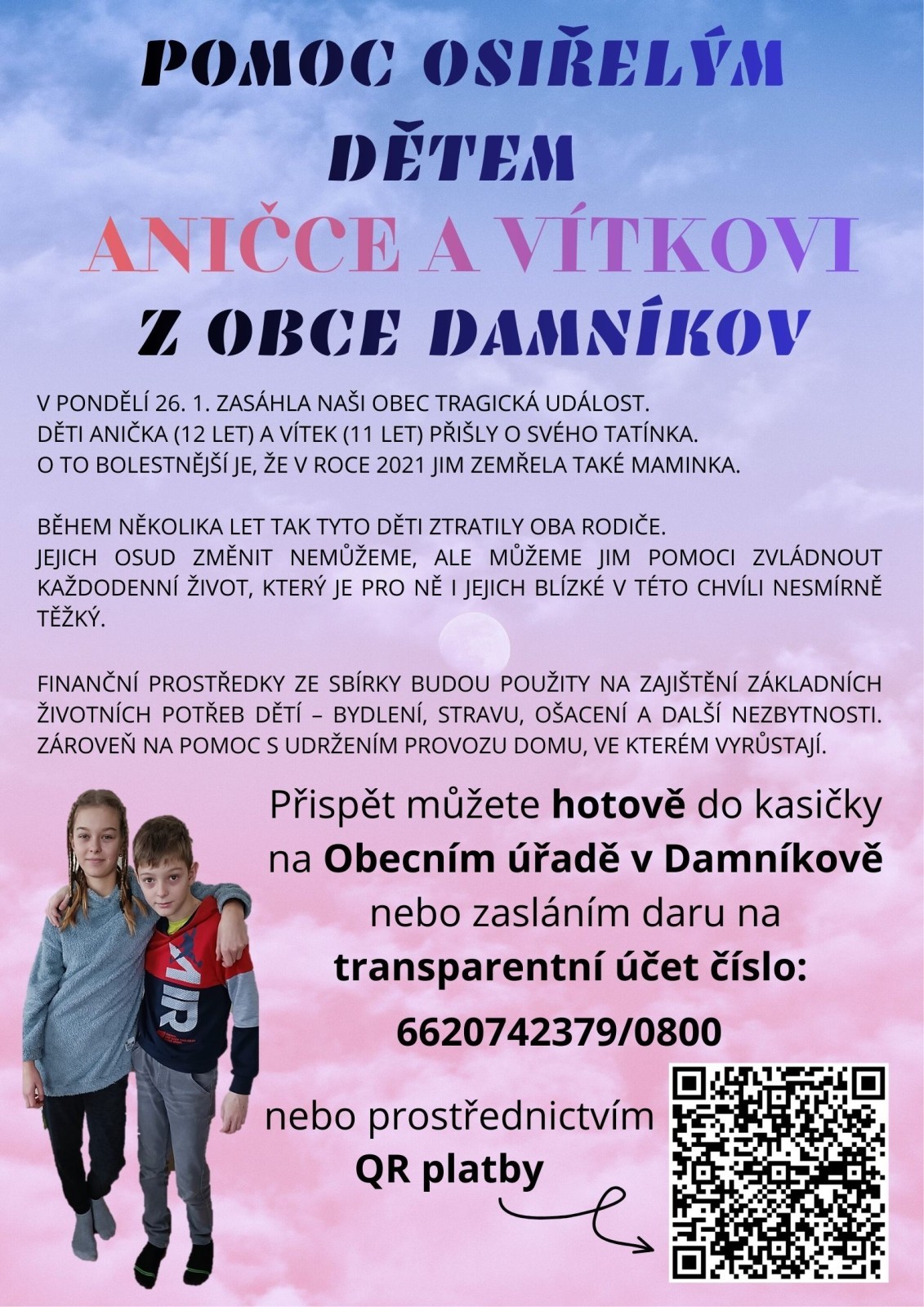 Pomoc osiřelým dětem – Aničce a Vítkovi z obce Damníkov