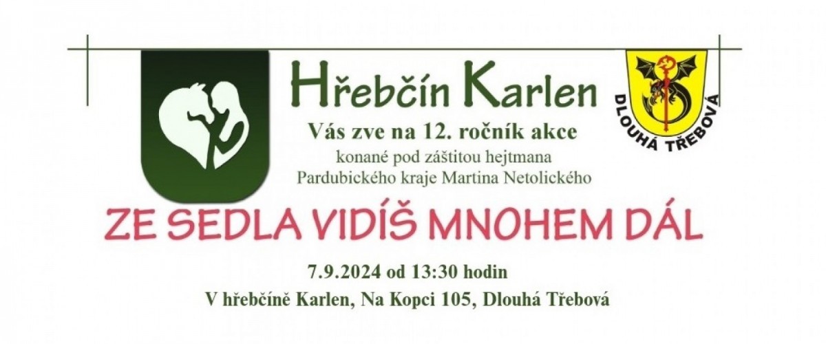 Zveme vás na akci hřebčína Karlen: Ze sedla vidíš mnohem dál, která se koná dne 7. 9. 2024 od 13 hod v hřebčíně Karlen v Dlouhé Třebové, viz přiložená pozvánka.