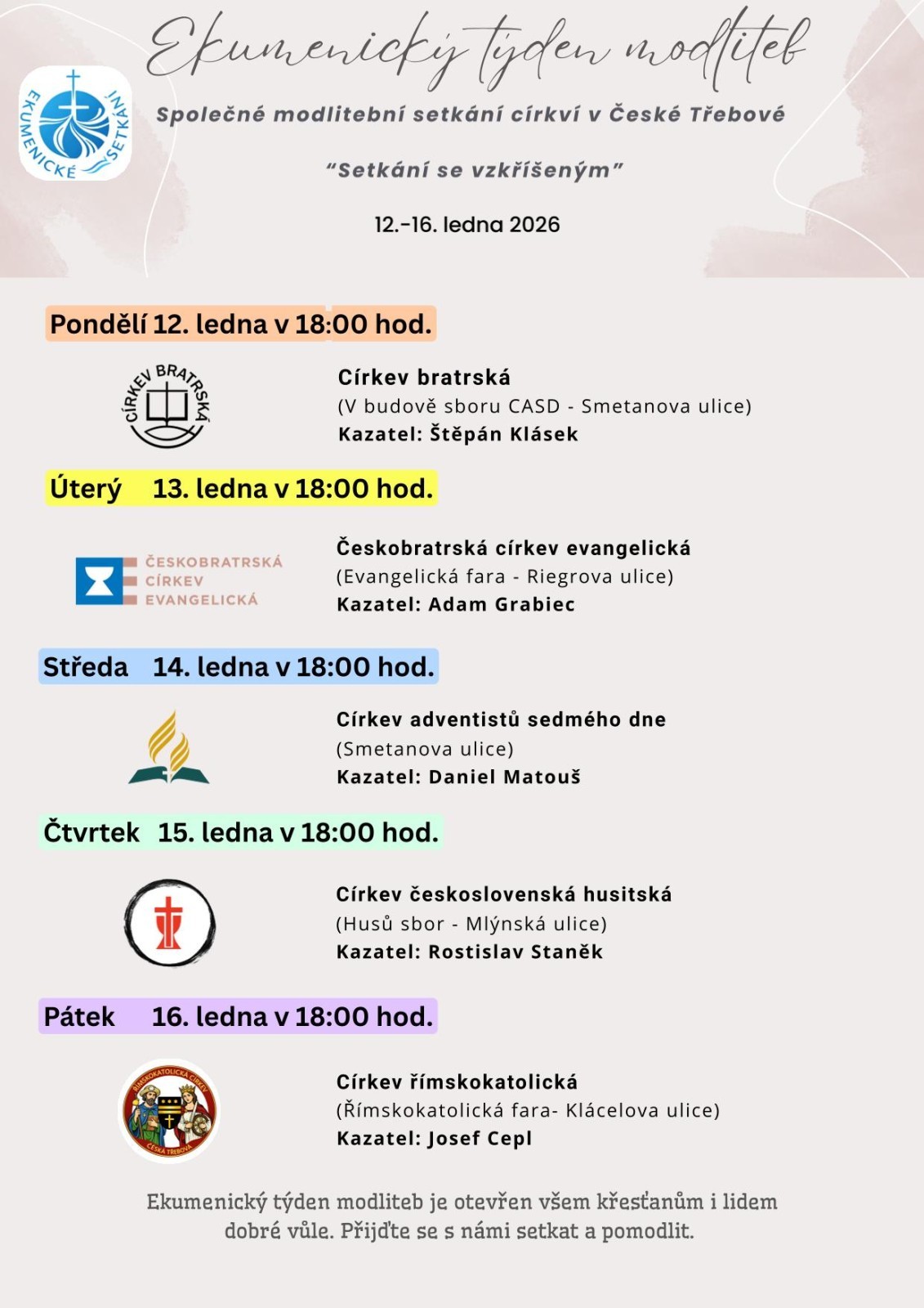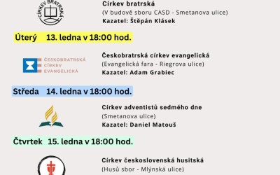 Srdečně vás zveme na Ekumenický týden modliteb, který se uskuteční od pondělí 12. do pátku 16. ledna 2026 v České Třebové. Každý večer od 18.00 hodin se setkáme ke společné modlitbě v jiném církevním společenství.