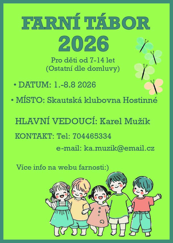 farní tábor 2026 se bude konat 1. - 8. srpna ve skautském domě v Hostinném. Tábor je určený dětem od 7 do 14 let (po domluvě ale rádi uvítáme i ostatní).