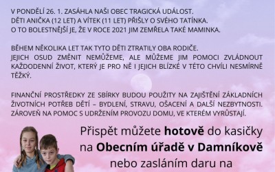 V pondělí 26. ledna zasáhla obec Damníkov smutná událost. Děti Anička a Vítek přišly o svého tatínka. O to bolestnější je skutečnost, že v roce 2021 jim zemřela také maminka. Během krátké doby tak tyto děti zůstaly bez obou rodičů.